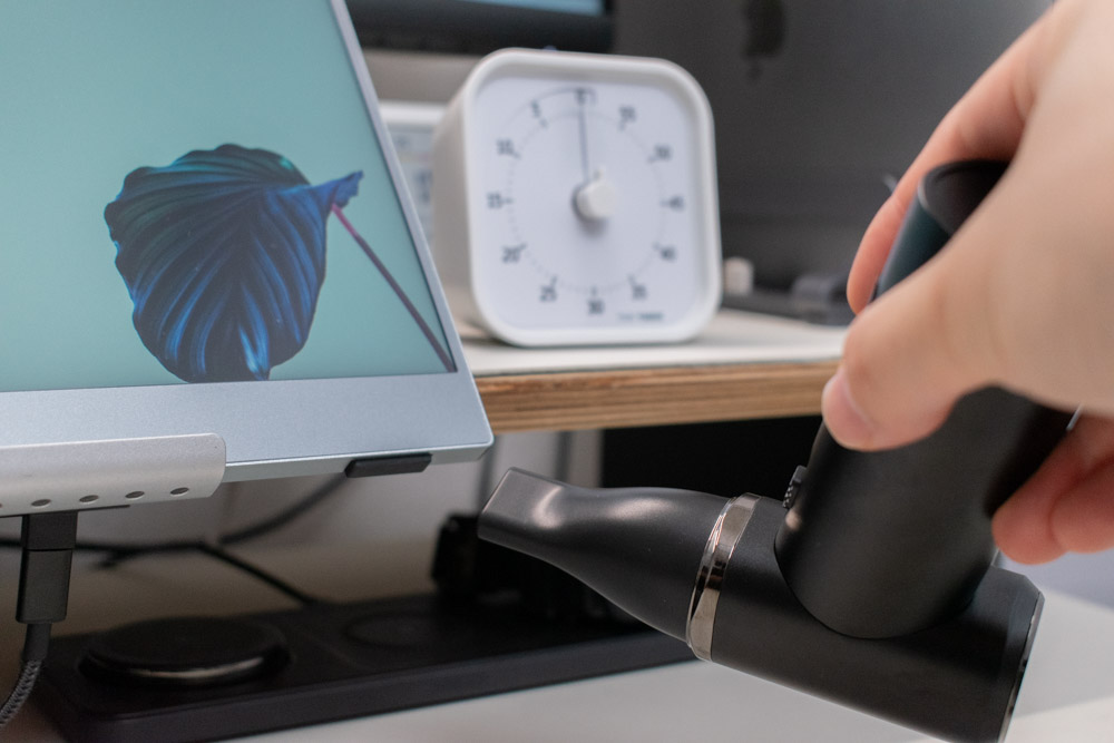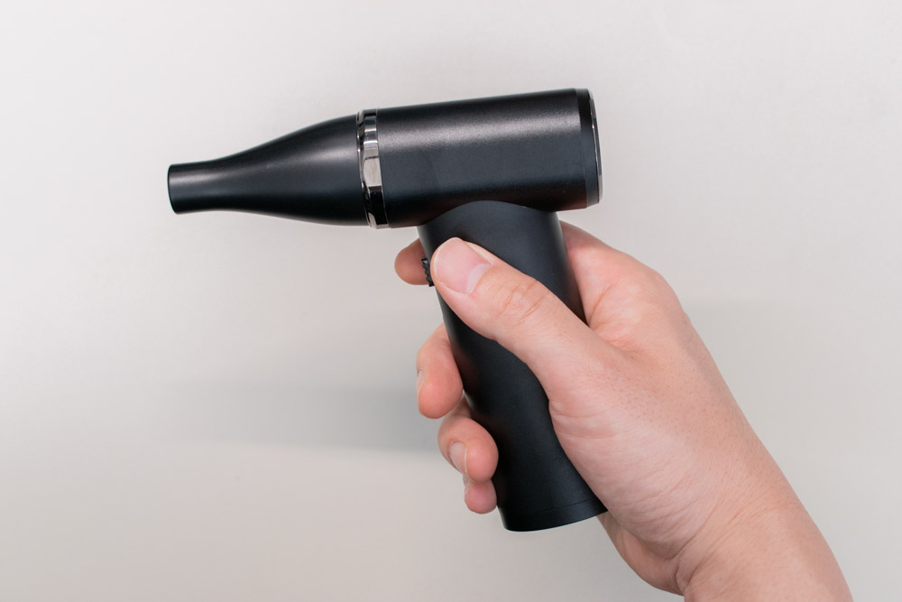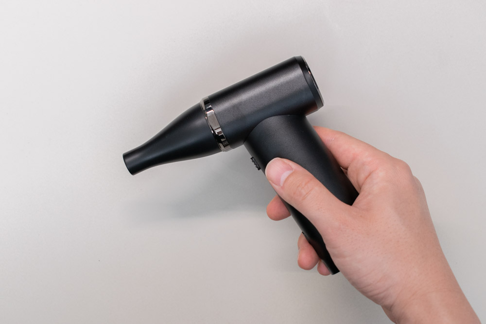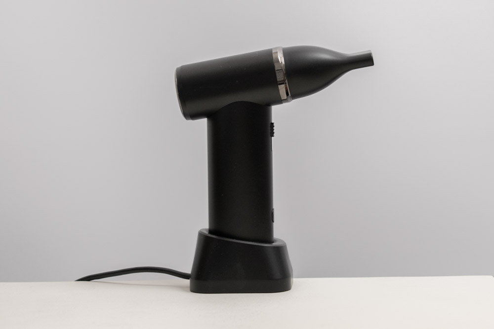 その点、この電動エアダスターはコンパクトなので引き出し収納も可能。充電スタンドに立てておいても場所を取らず、こまめに掃除を行いたいユーザーには非常に有用なんですよね。