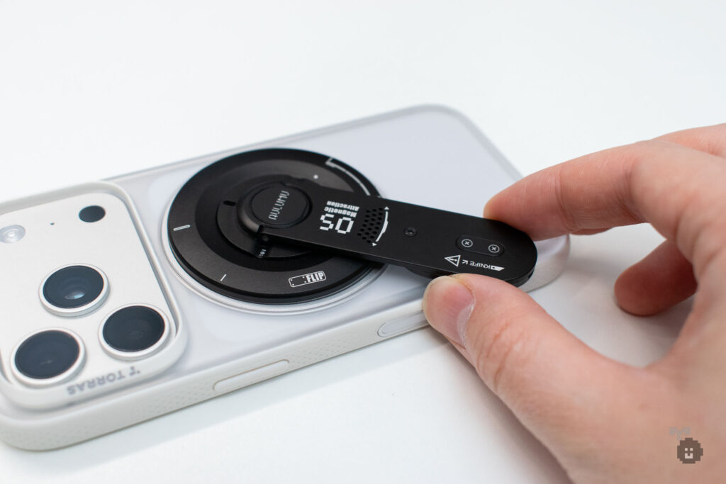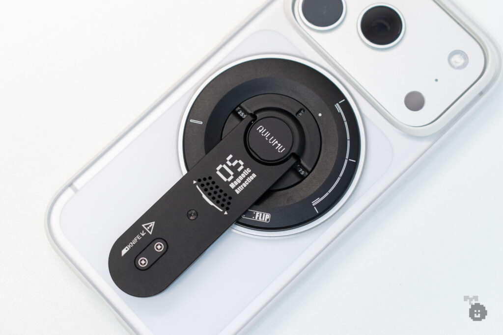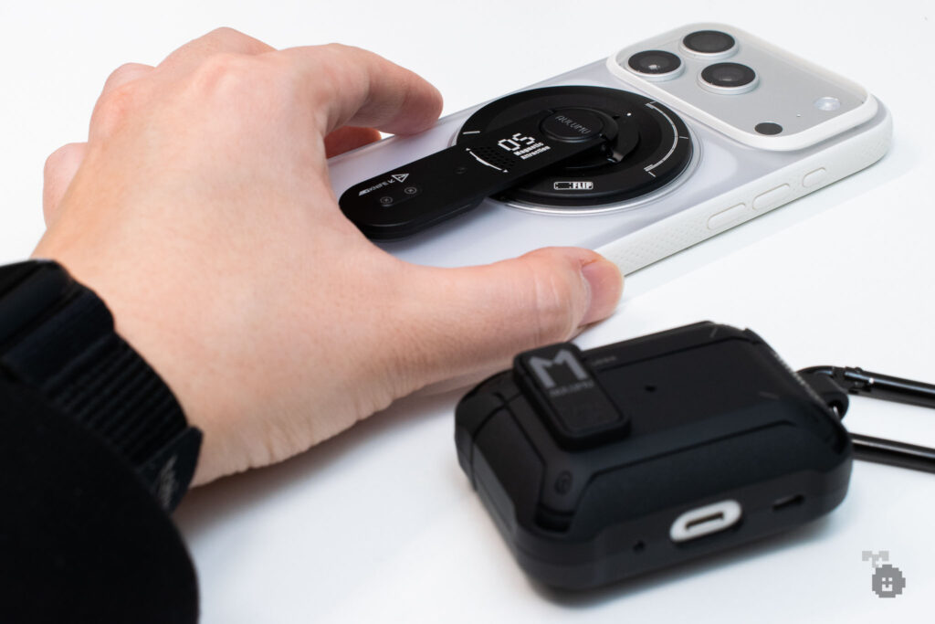 | 機能 | マグネットスタンド (縦置き/横置き) 隠しボックスカッター (セラミックナイフ) スマホグリップ (スタンド反転時) フィジェットトイ (回転時のクリック音) |