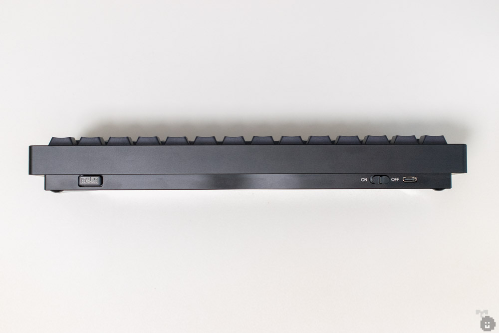 端子類はすべて上側にまとまっていて、USB Type-C端子・電源スイッチも上部左側に配置。上部右側にはレシーバーが刺さっています。レシーバーの刺さり方は割と緩めですが、まあ基本据え置き使用な訳で、許容範囲でしょう。