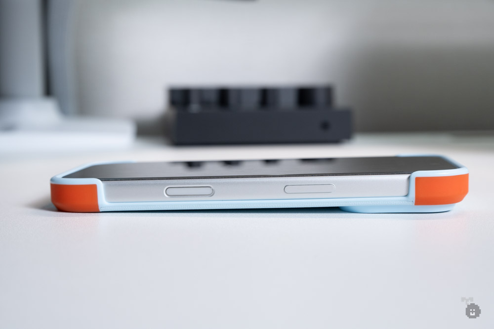 上下部分は割と出っ張っていて、四隅はバンパーのような硬い構造になっています。万が一落としても、角から地面に落ちれば衝撃吸収の役割は果たしてくれそうです。