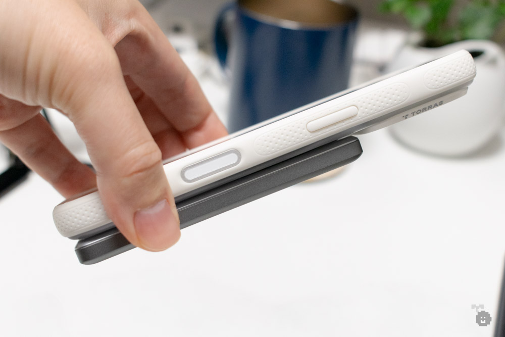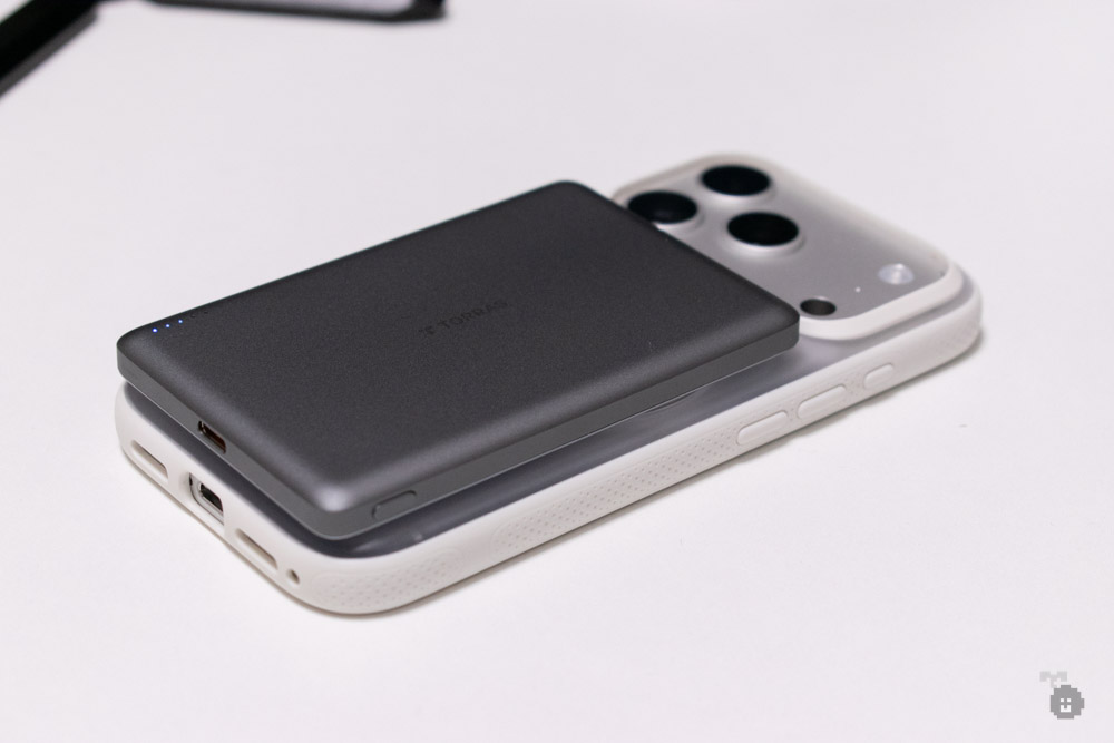 当たり前なのですが、無接点充電対応のモバイルバッテリーも余裕で使えます。こちらは同社の薄型モバイルバッテリー(一緒にご提供いただきました)ですが、MagSafeの吸着具合も良好。
